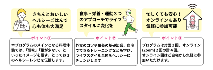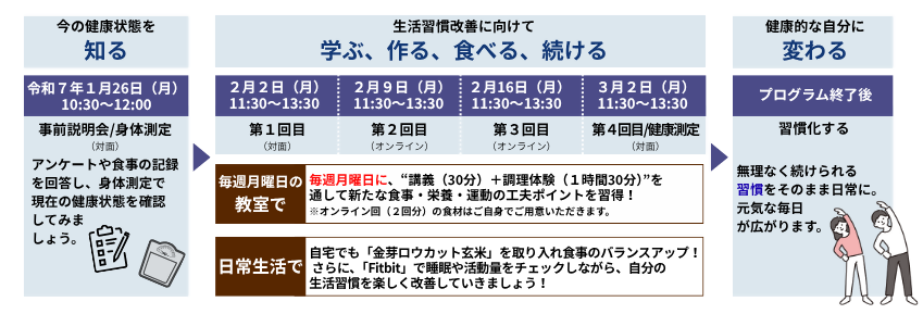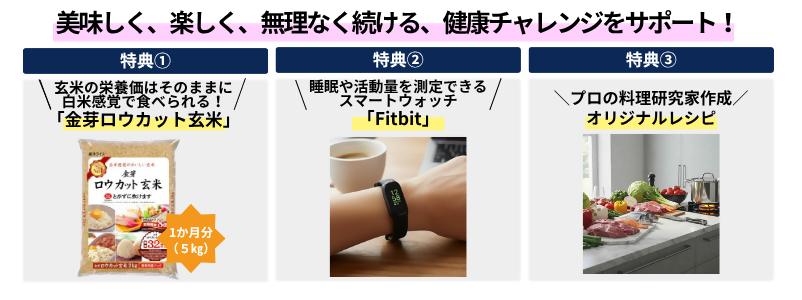 毎週1回、「減塩・カロリーダウン」などのテーマで講義後、実際にヘルシーでおいしいレシピをグループで調理します。さらに、スマートウォッチや金芽ロウカット玄米など参加特典で日常生活習慣をサポートします。