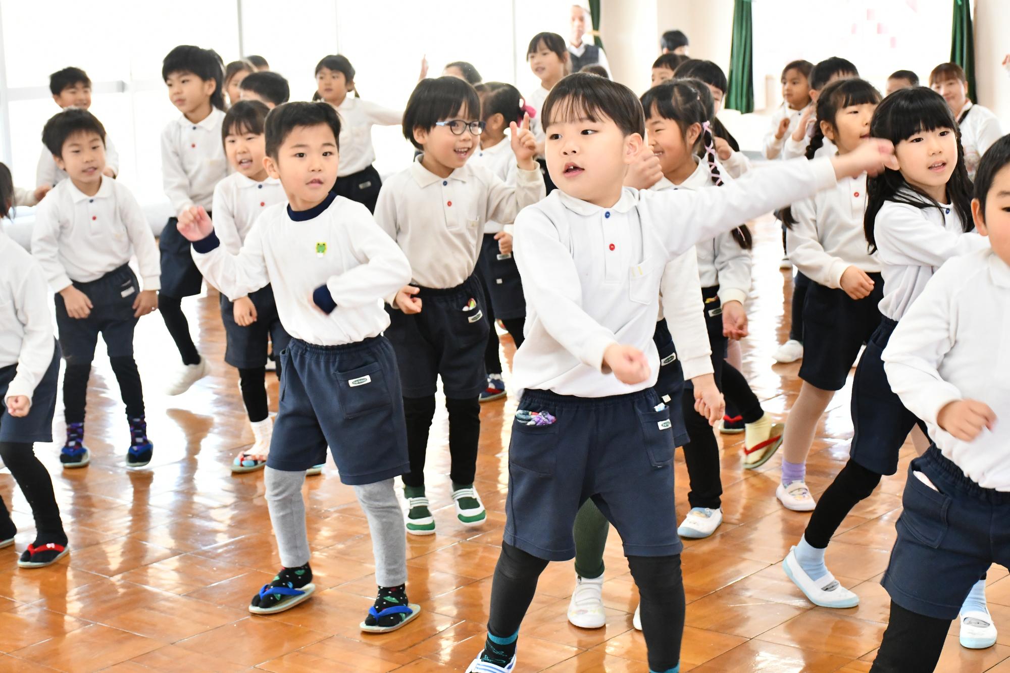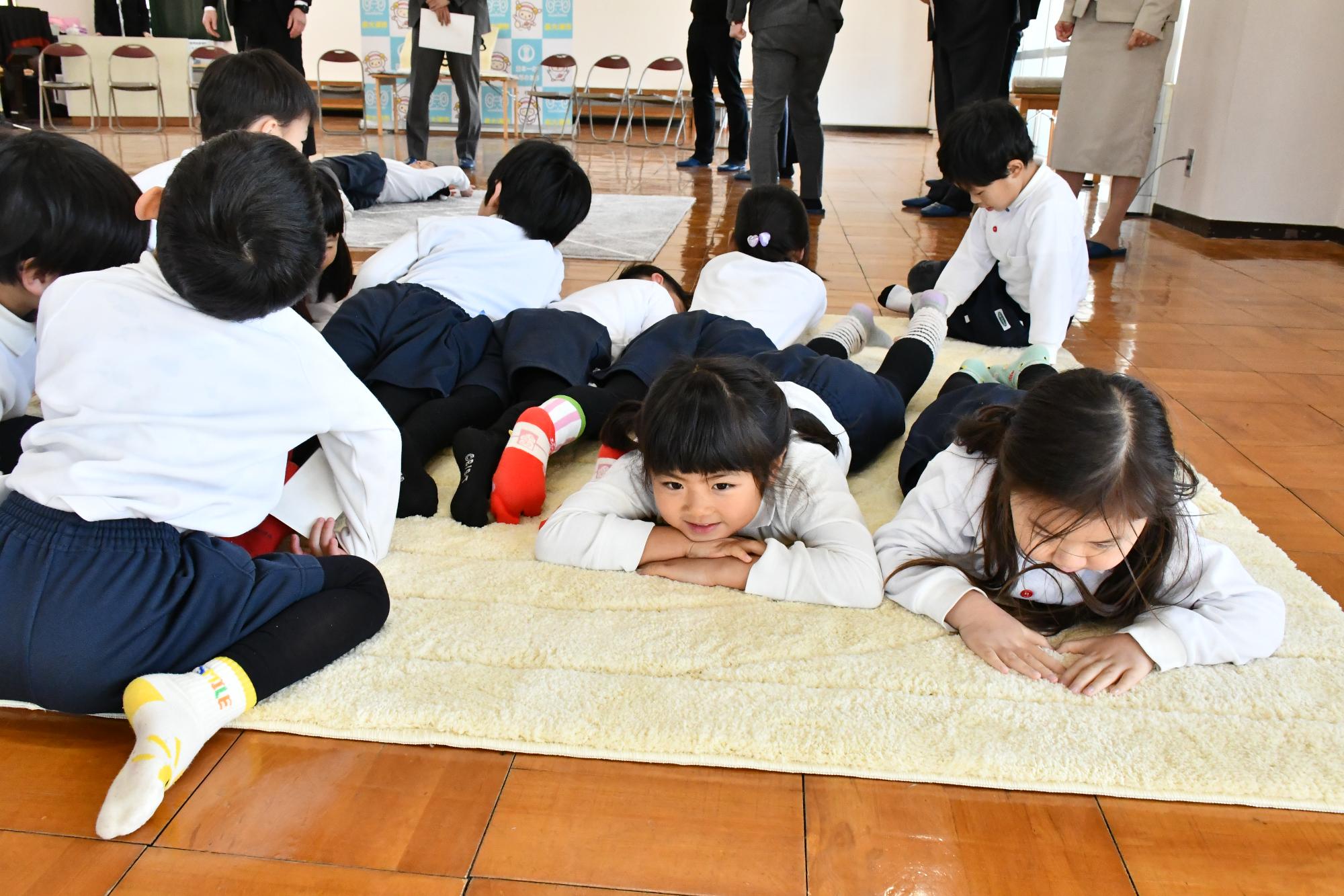 寄贈式では、𠮷田房織物株式会社から園児へ直接寄贈品が手渡されたほか、園児たちが実際に素材が異なる5種類のカーペットに触れ、寝転んだりジャンプしたりしながら違いを体験する「カーペット体験」を実施しました。また、園児からは寄贈のお礼としてパフォーマンスの披露やメッセージカードが贈呈されました。