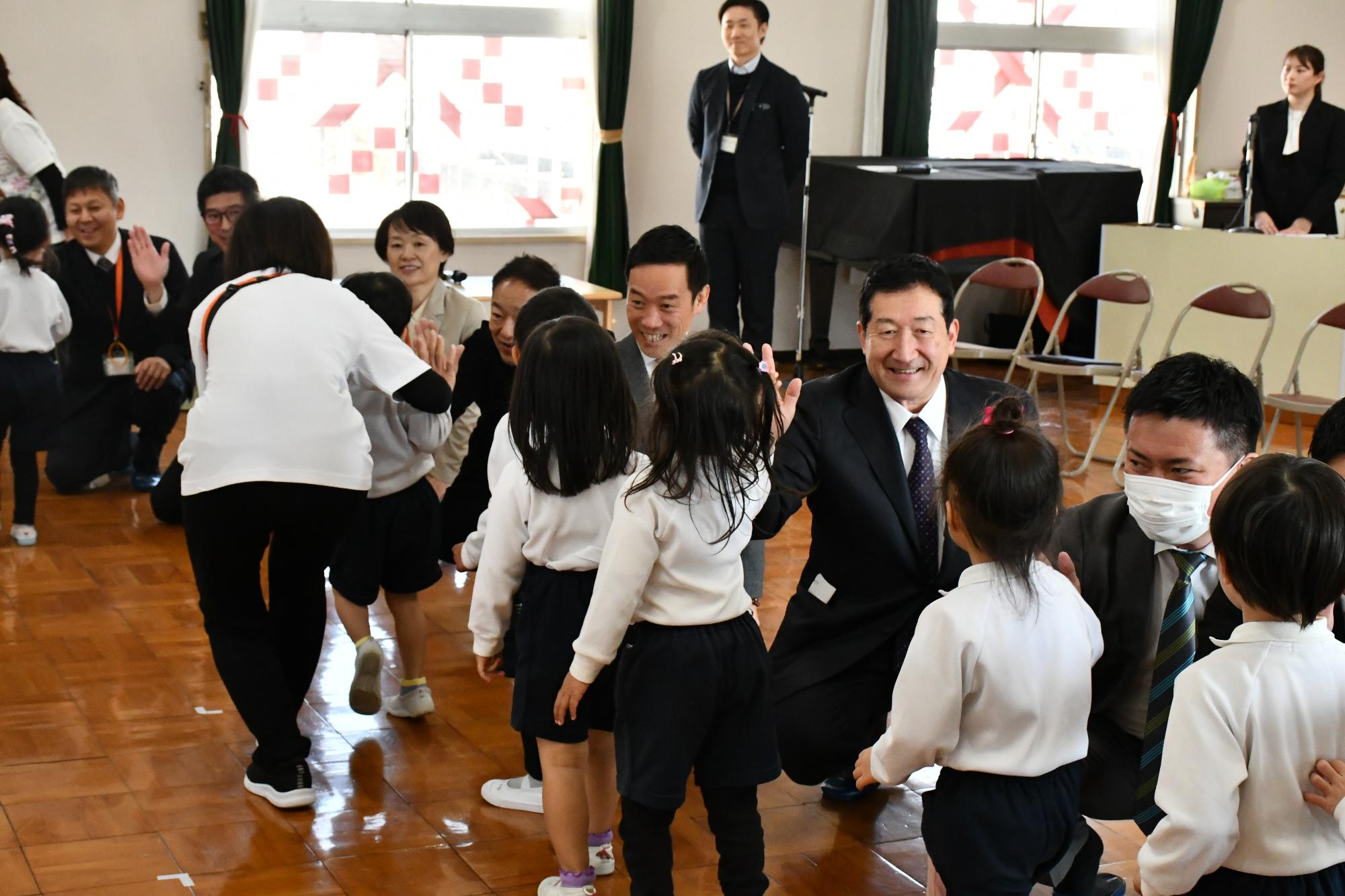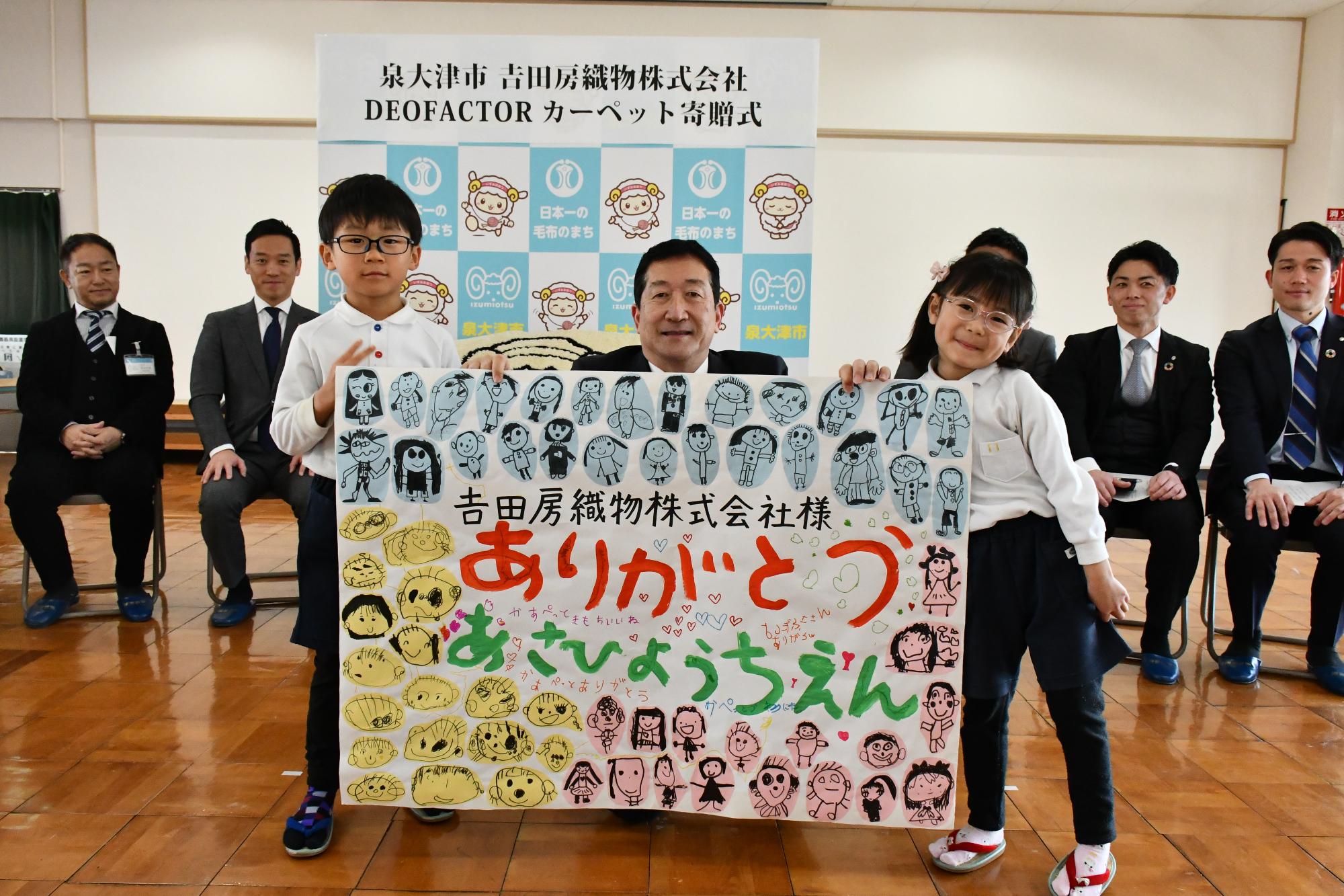 左から𠮷田房織物株式会社 𠮷田代表取締役社長・園児代表3名・泉大津市 南出市長