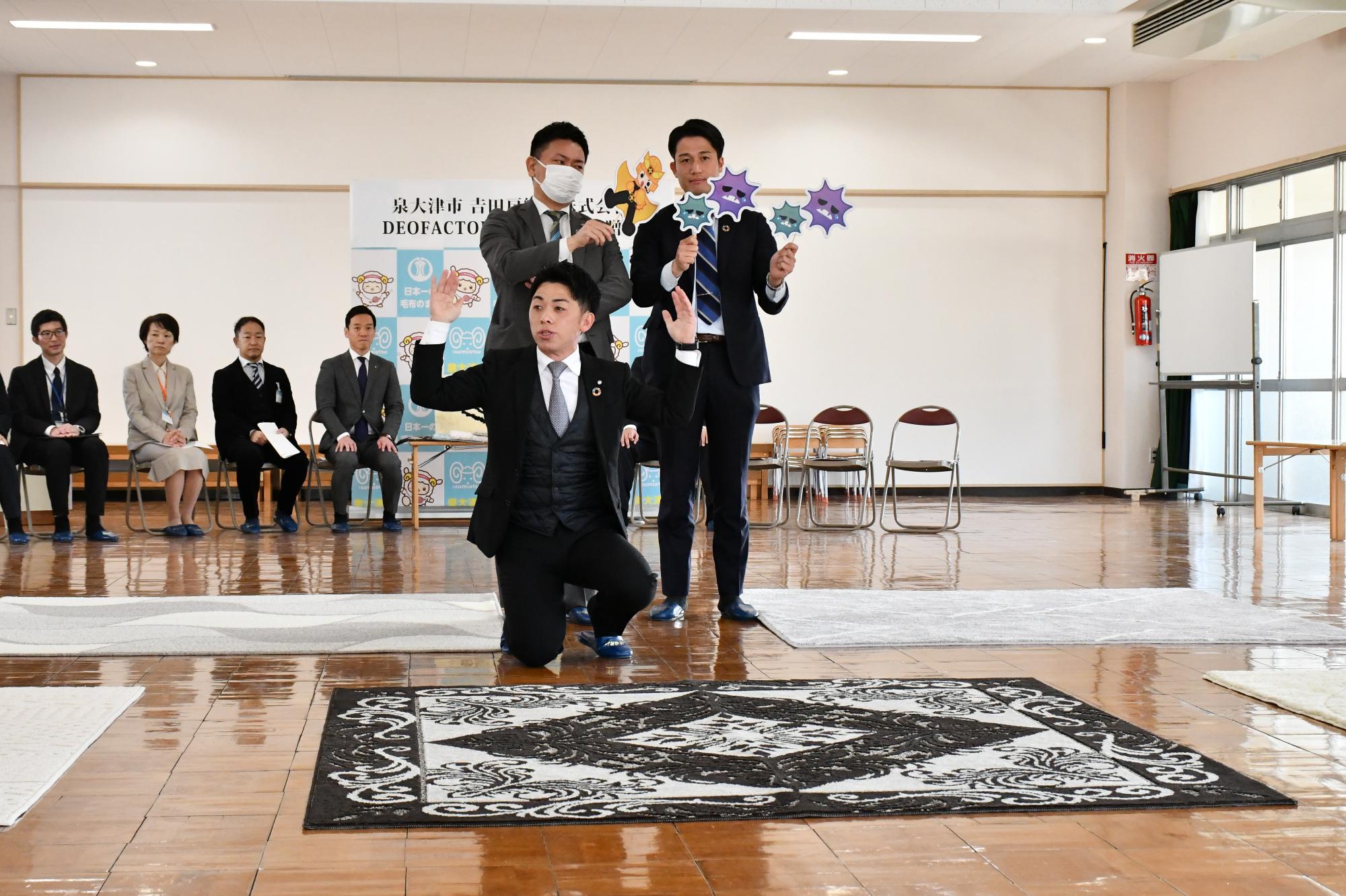 令和8年1月19日に地元繊維企業である𠮷田房織物株式会社(泉大津市、代表取締役社長:𠮷田裕紀)から、こどもたちが安全・安心に過ごせる教育・保育環境の充実と、市内繊維産業の価値発信を目的として、高機能なDEOFACTORカーペットの寄贈を受け、泉大津市立旭幼稚園において寄贈式を実施しました。
