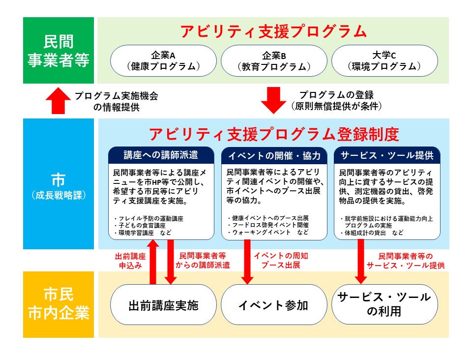 ヘルスケア関連や教育関連、環境関連の民間事業者等が、その保有する、市民・自然環境のアビリティ向上を支援するプログラムを提供する仕組みを構築することにより、「アビリティタウン構想」の実現につなげることが目的です。