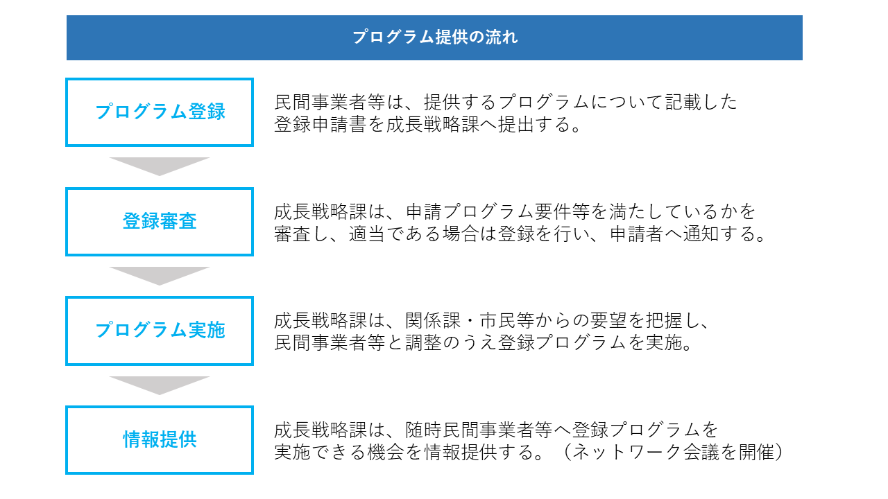 ⇒登録された事業者名や登録プログラムは成長戦略課が市の一元的な窓口となり関係部署に情報共有を行うとともに、市ホームページで発信します。