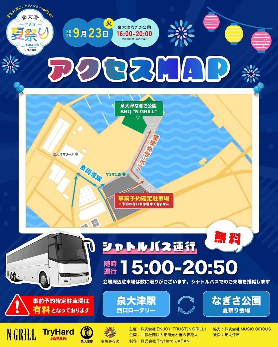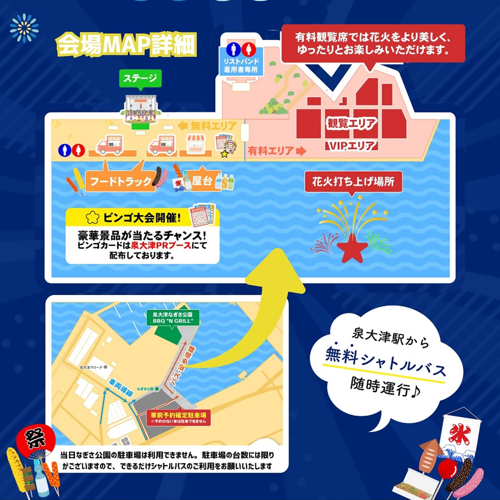 泉大津駅より20分間隔で無料シャトルバスを運行しておりますので、ご来場にはシャトルバスをご利用ください。