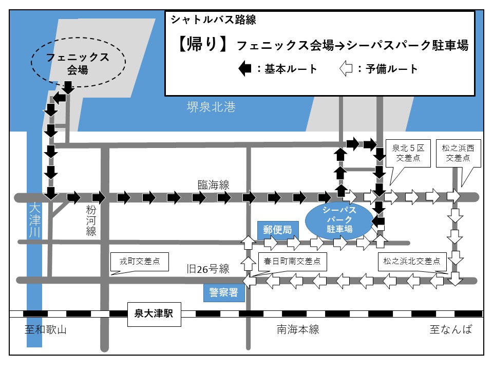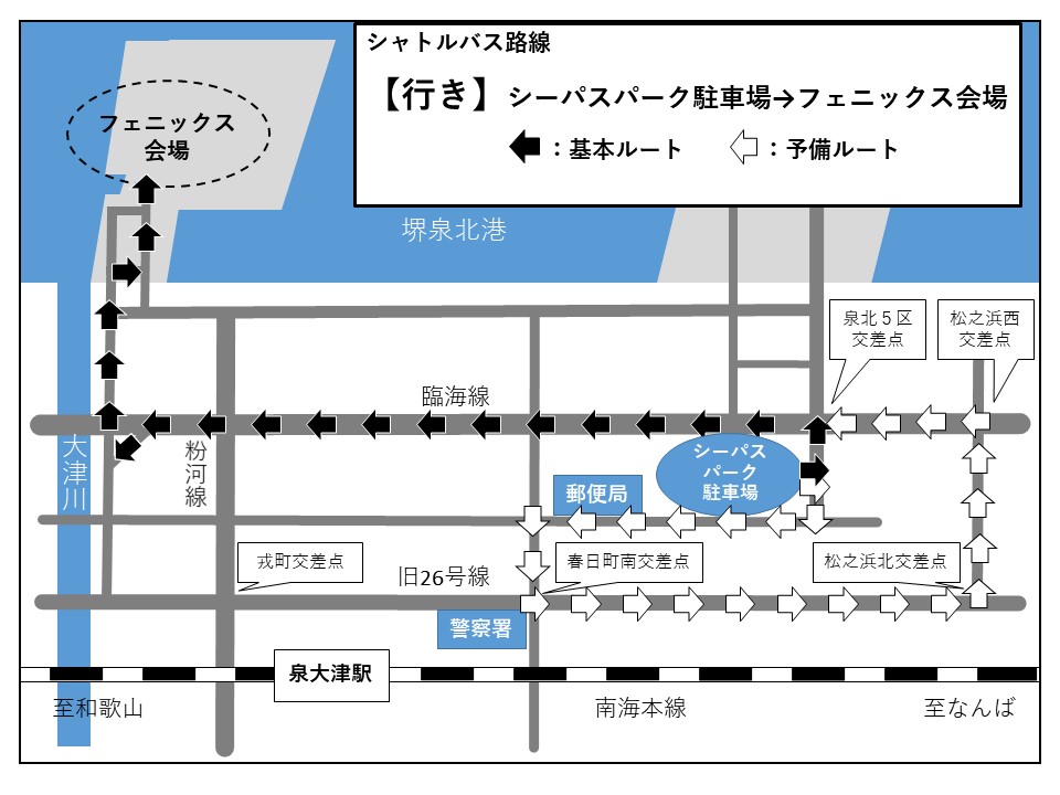フェニックス会場 → (バス) → 松之浜西交差点右折 → 松之浜北交差点右折 → 春日町南交差点右折 → バス発着場(シーパスパーク駐車場)→(徒歩)→ 泉大津駅