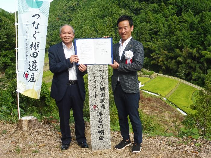 地域住民らが多数見守る中、橋本市北部柱本地区にある芋谷の棚田で泉大津市の南出賢一市長と橋本市の平木哲朗市長が協定書に署名しました。棚田は2月、農林水産省から「つなぐ棚田遺産」に選定されており、記念碑の除幕も合わせて実施しました。
