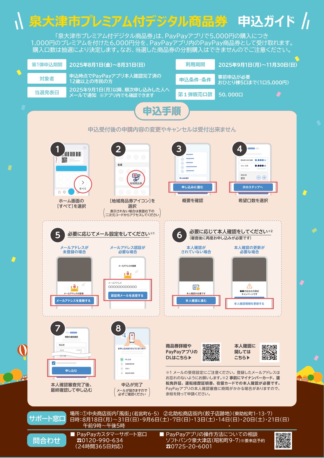 また、PayPayコールセンターや、泉大津市内のソフトバンクショップでもPayPayアプリの操作方法についてやお申込み方法等のご相談ができます。ソフトバンクショップご利用の際は事前にご連絡の上、ご相談ください。