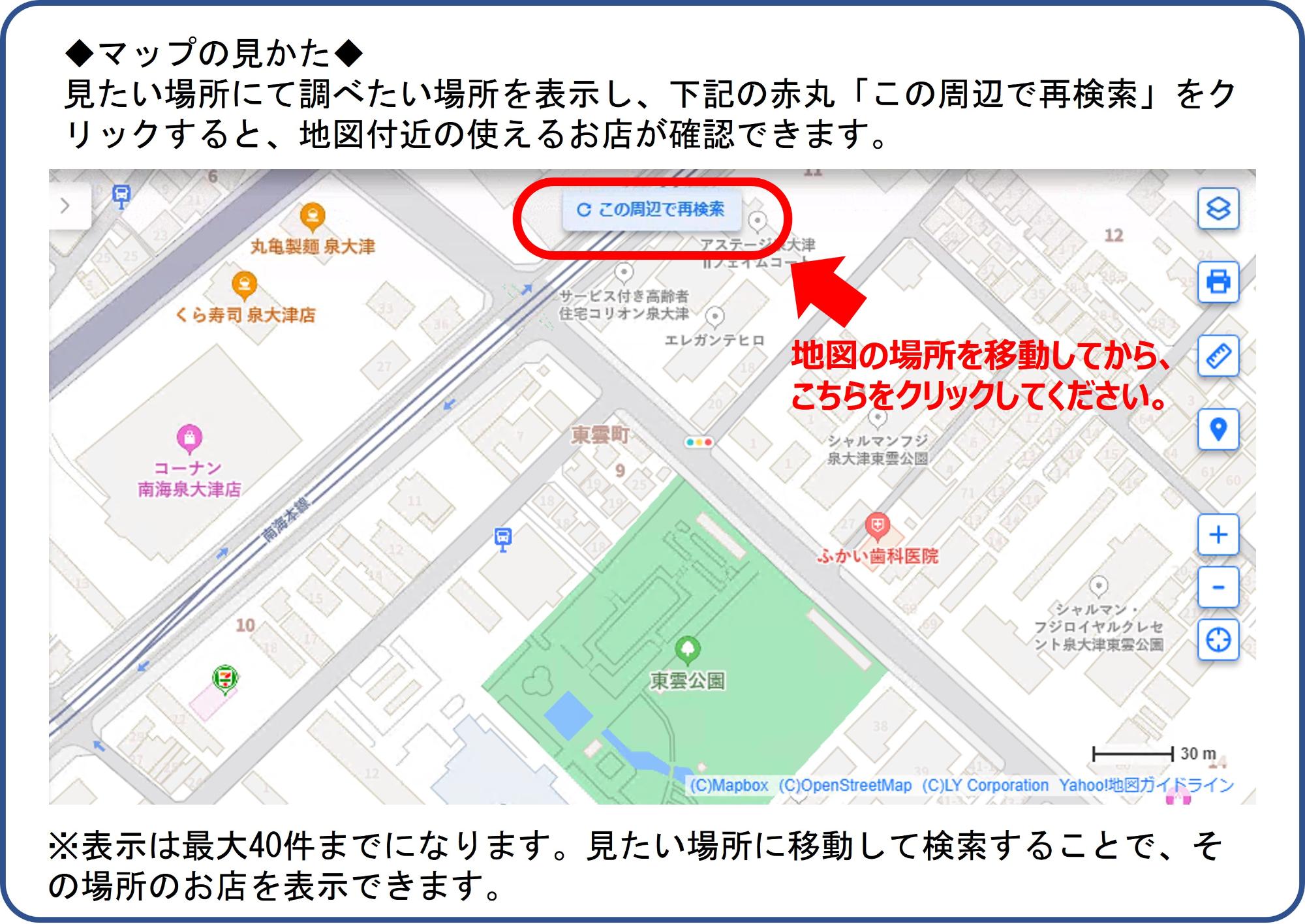 初期表示は40件までとなります。移動/拡大・縮小した場合は「この周辺で再検索」をクリックしてください。