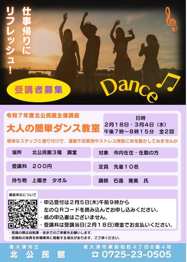 2月受付の北公民館主催講座 更新日:2026年02月01日 大人の簡単ダンス教室 この記事に関するお問い合わせ先 〒595-0006 大阪府泉大津市東助松町4丁目8番4号 北公民館電話番号:0725-23-0505 ファクス:0725-23-0566 みなさまのご意見をお聞かせください このページの内容は分かりやすかったですか 分かりやすかったふつう分かりにくかった このページは見つけやすかったですか 見つけやすかったふつう見つけにくかった このページに関してのご意見がありましたらご記入ください。 当フォームは、返信不可能のため、ご質問にはお答えすることができません。