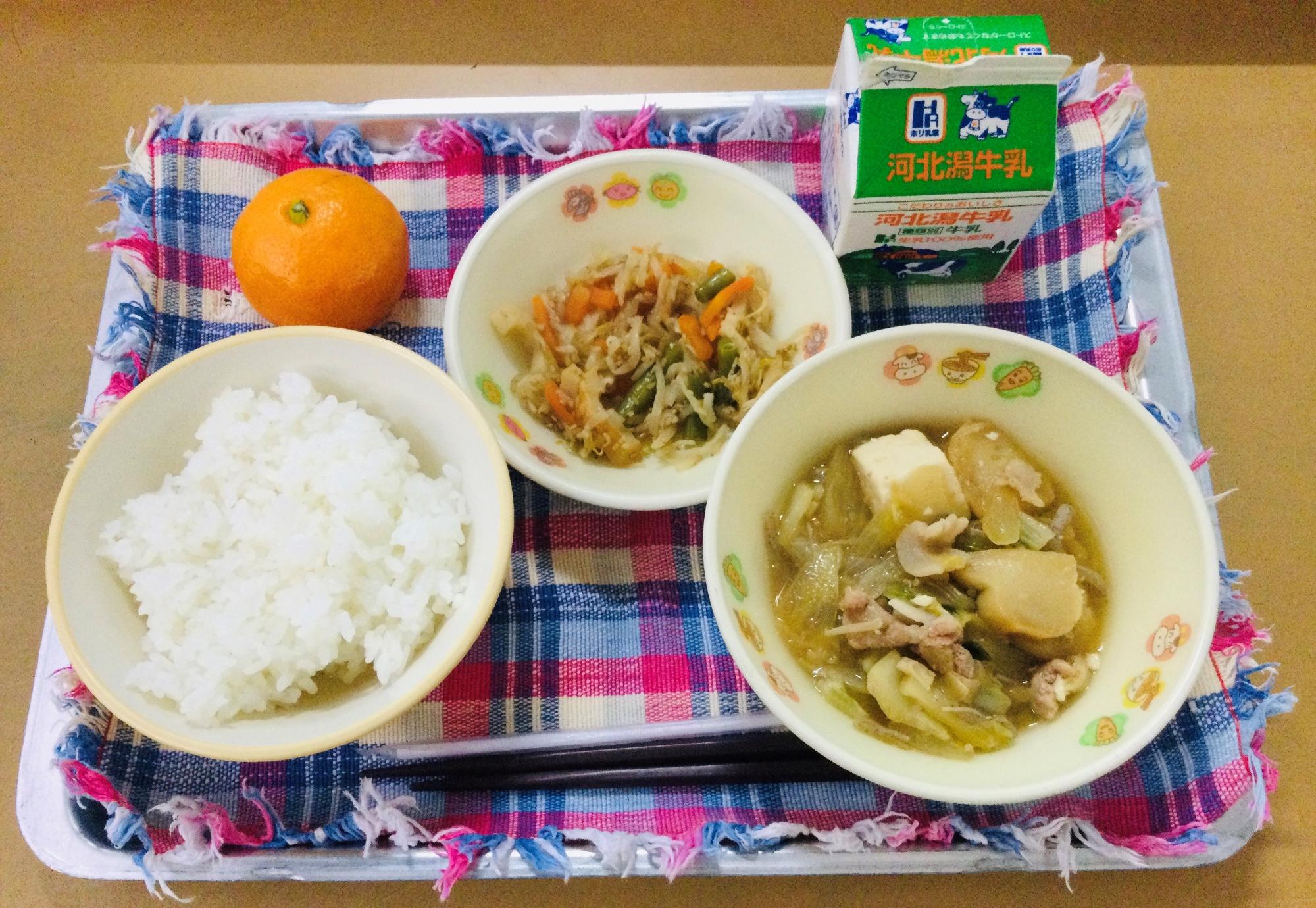 当日の献立は、小学校は「ごはん(金芽米)」・「豚すき焼き」・「もやしのごま酢炒め」・「みかん」、中学校は「ごはん(金芽米)」・「チキンカレーライス」・「コロッケ」・「みかん」でした。