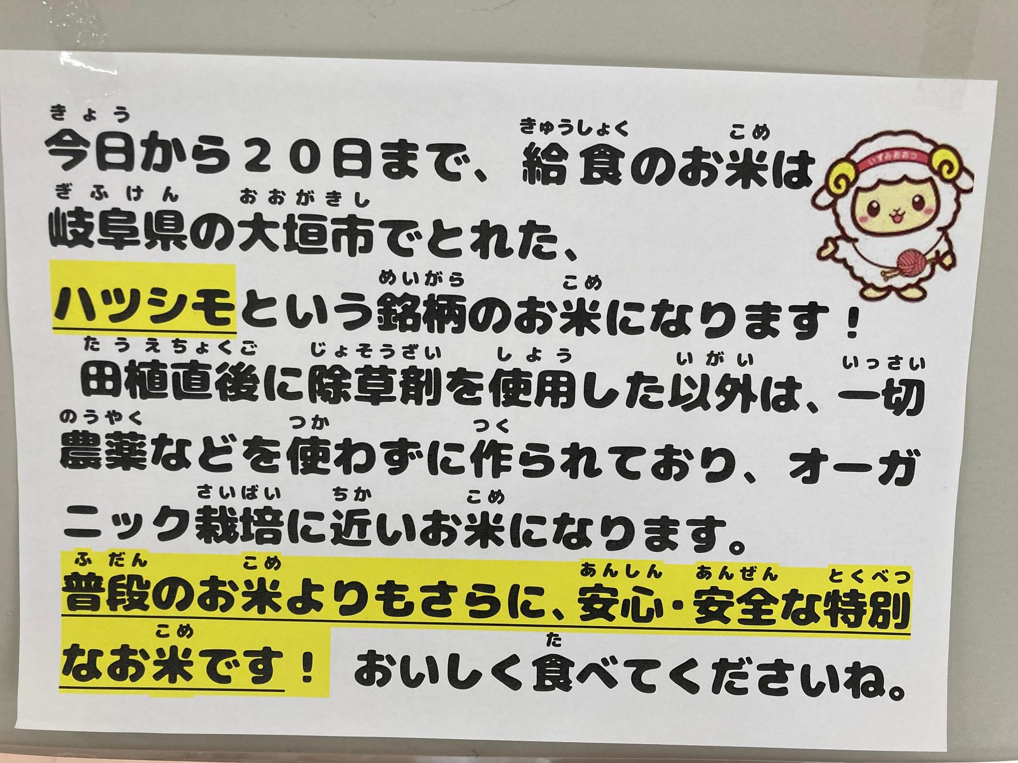 小中学校の給食で、岐阜県大垣市で作られた「ハツシモ」という銘柄のお米を使用しました。