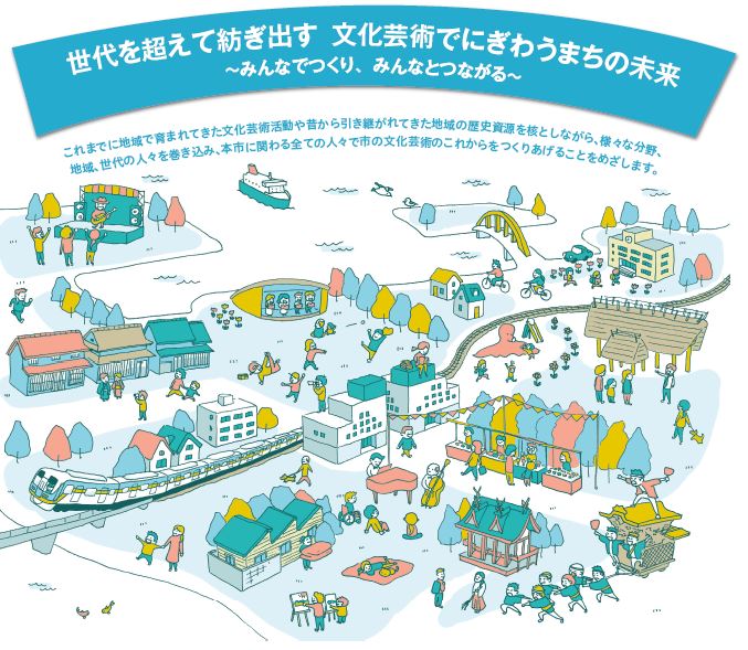 「世代を超えて紡ぎ出す 文化芸術でにぎわうまちの未来~みんなでつくり、みんなとつながる~」をコンセプトに掲げ、本市の文化芸術を今以上に振興していくために、本市でこれまで取り組まれてきた文化芸術活動や先人から引き継がれた歴史資源を土台とし、市の内外や様々な分野、幅広い世代の人を巻き込み、本市に関わる全ての人々で市の文化芸術のこれからをつくりあげることをめざしています。