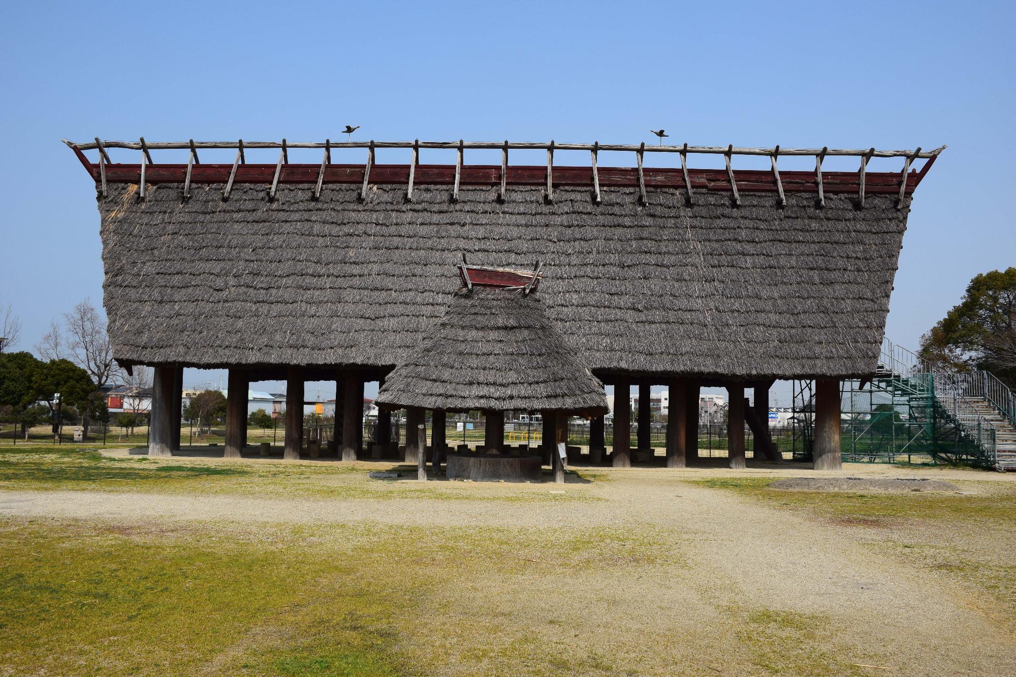「大型掘立柱建物」(愛称 いずみの高殿) ・床面積133平方メートル(約80畳) ・床高4メートル ・独立棟持柱9メートル ・全高11メートル ・屋根面積400平方メートル |