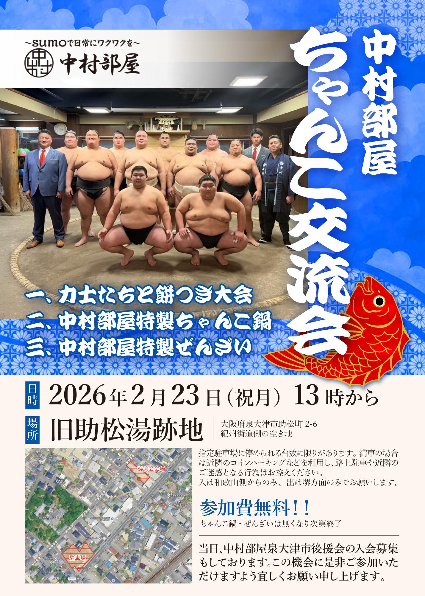 中村部屋による地域貢献イベントとして、旧助松湯跡地にて「中村部屋ちゃんこ交流会」が開催されます。