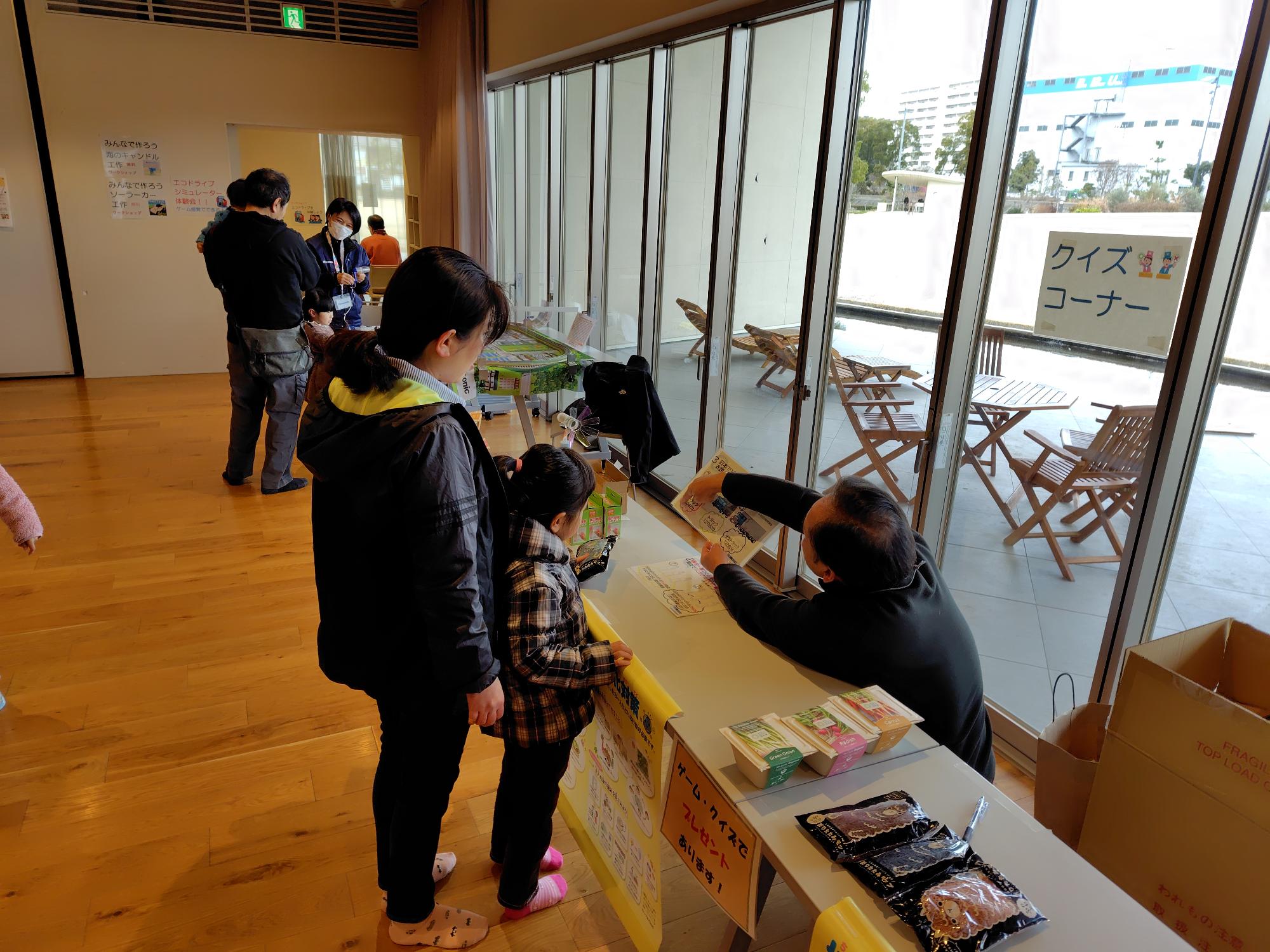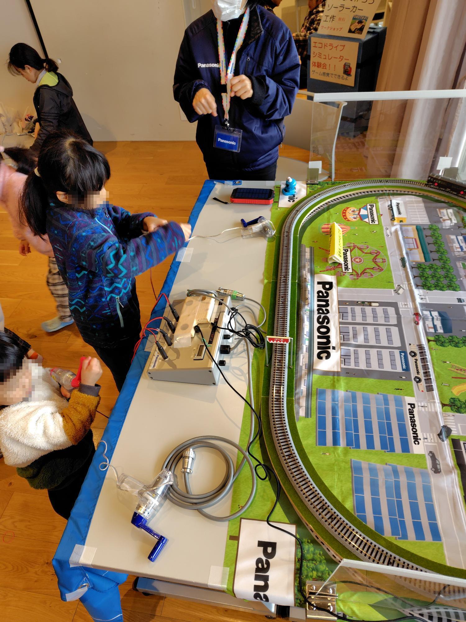 今回は体験コーナーに力を入れていて、Panasonicさんの「太陽光と手回し発電で動くソーラートレイン」や「クイズコーナー」があり、「工作ブース」ではなんと2種類の工作が体験できました。