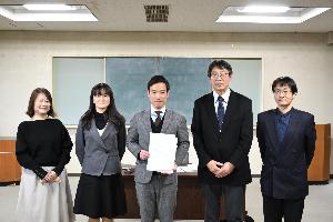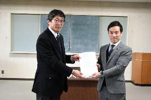 南出市長より、泉大津市環境保全審議会会長に選出された、竹中規訓会長(大阪府立大学大学院 教授)へ諮問書が手渡しされました。