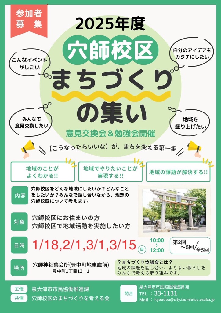 穴師校区では、地域の課題を共有し、より良いまちづくりを考えるための意見交換会&勉強会、「穴師校区まちづくりの集い」を開催します。