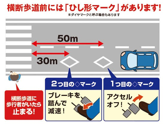 横断歩道の手前には、ひし形マークがありますので、気を付けて走行して下さい。