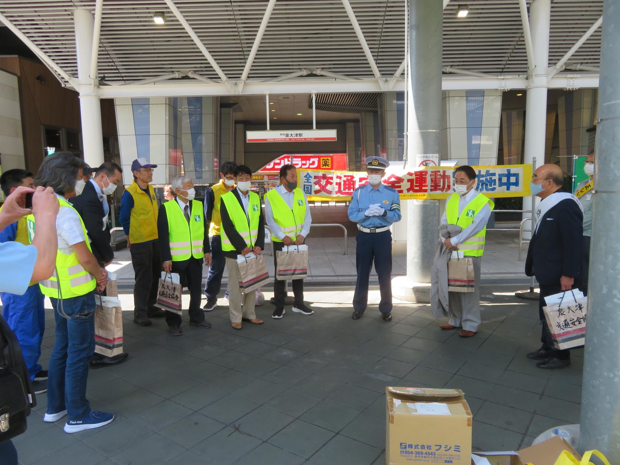 春と秋の全国交通安全運動の初日に南海泉大津駅東側ロータリー周辺にて、泉大津警察署や泉大津交通安全協会・地域交通安全推進委員と合同で通勤・通学者に向けて交通ルールやマナー遵守を呼びかける街頭キャンペーンを実施しました。