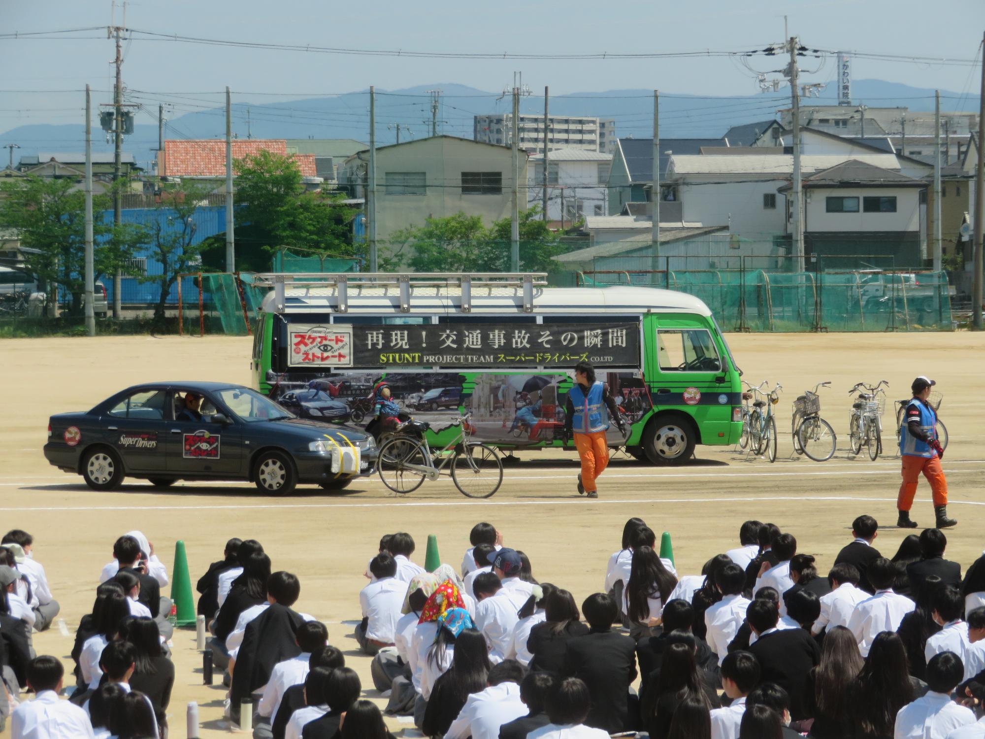 令和5年4月から努力義務となった自転車ヘルメットの着用を呼びかけようと、泉大津警察署・泉大津交通安全協会等と連携して令和5年5月12日に府立泉大津高等学校においてプロのスタントマンが事故を再現する交通安全教室を実施しました。