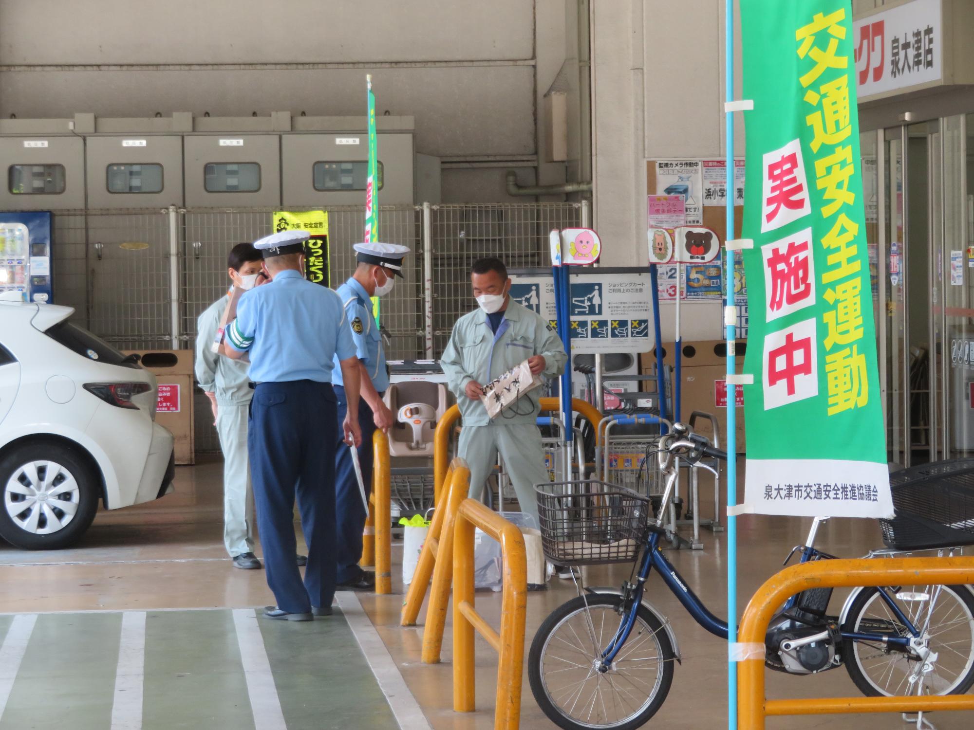 春と秋の全国交通安全運動に伴い、南海泉大津駅東側ロータリー周辺・スーパーオークワ泉大津店駐車場にて泉大津警察署や泉大津交通安全協会・地域交通安全推進委員と合同で交通事故防止を図るための街頭キャンペーンを実施しました。
