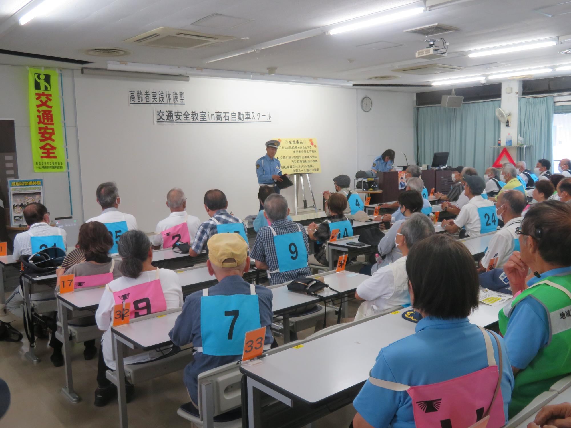 春と秋の交通安全運動期間中に高石自動車スクールにて、泉大津市、忠岡町、高石市および泉大津警察署、高石警察署と泉大津交通安全協会、高石交通安全協会、高石自動車スクールと合同で、高齢者を対象とした実践体験型の交通安全教室を実施しました。 自動車スクール内のコースを安全確認しながら運転したり、室内において警察署員の交通安全講話とDVD鑑賞をしたりと交通安全意識の向上を図りました。