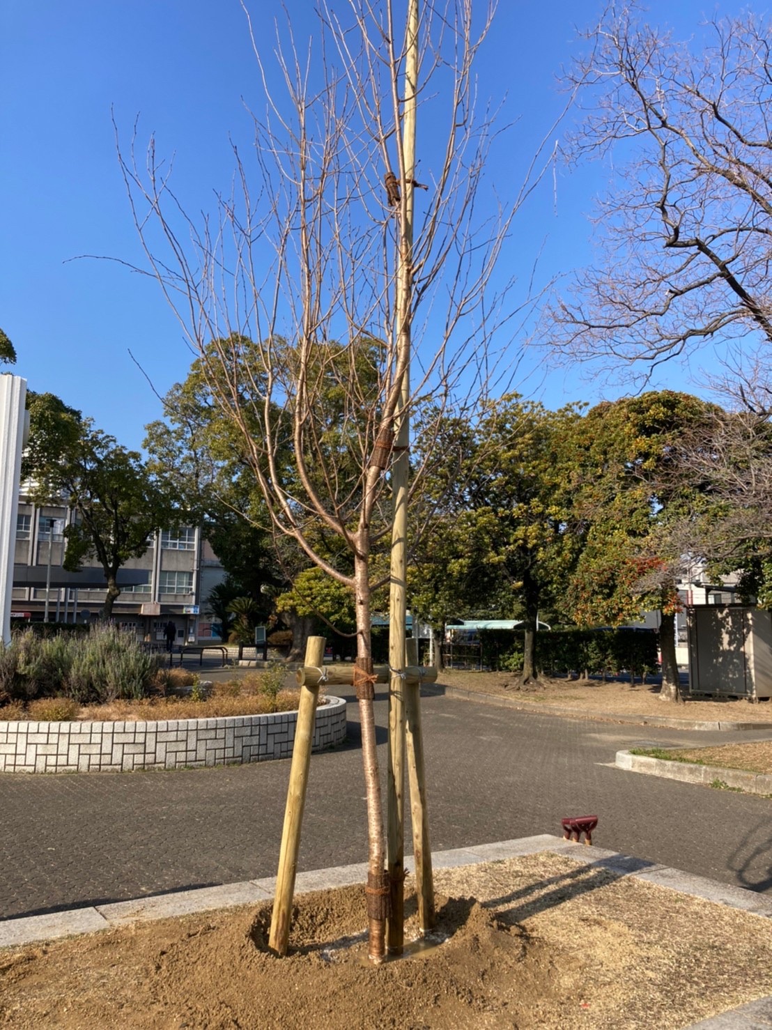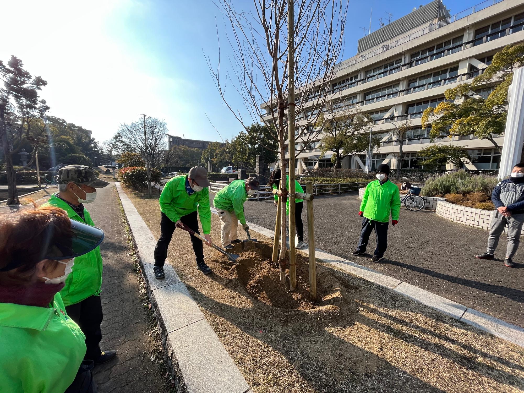 日頃より市内の公園等で緑化活動をしていただいているボランティアの方々に、東雲公園、助松公園に桜の木を植えていただき、植樹祭を行いました。この桜は、”2025年の大阪・関西万博に向け、大阪府下で2025本の桜を植えよう”という「万博の桜2025」として本市に寄贈いただいたもので、この植樹祭では計3本の桜の植樹にご協力いただきました。