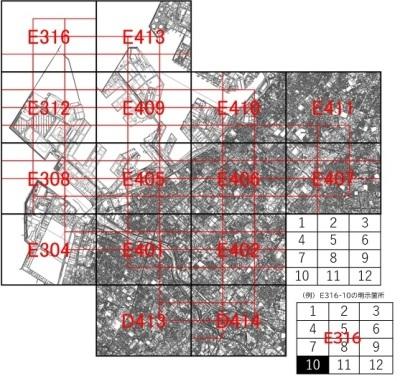 ※上記凡例の区画割は、おおよその位置となり、閲覧及び印刷する際は、上記の区画割より少し広い範囲が1ページに表示されます。ご了承ください。