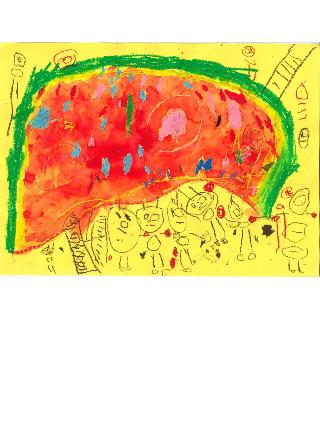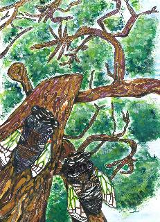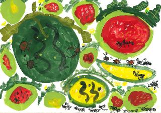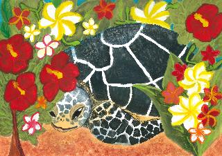 作品タイトル 「花と緑にかこまれるウミガメ」