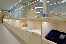 店舗では、リビングケットなどの寝装具や、ベビースリーパーやセーターなどの衣服、手芸用毛糸といった雑貨に至るまで、多岐にわたる泉大津産の繊維製品を揃えています。商品は、手に取ることができ、購入することも出来ます。