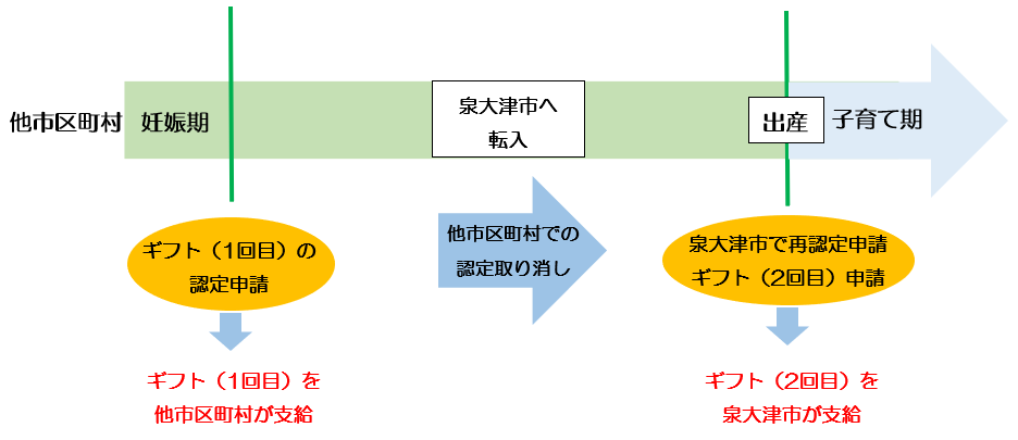 ・転入前の市区町村で妊娠届を提出し、出産応援ギフトまたは妊婦支援ギフト(1回目)の支給を受けた後、妊娠中に泉大津市に転入した場合。
