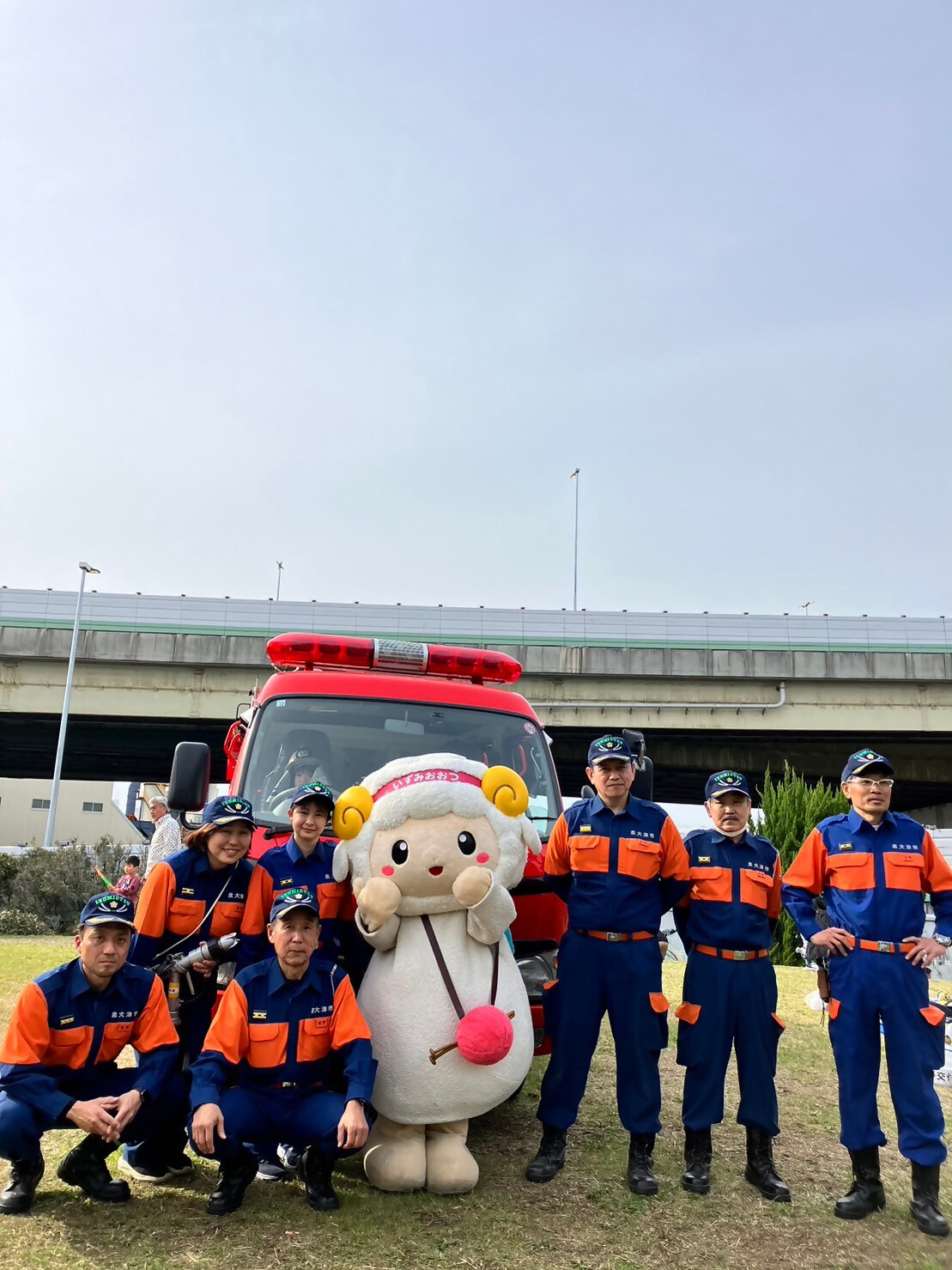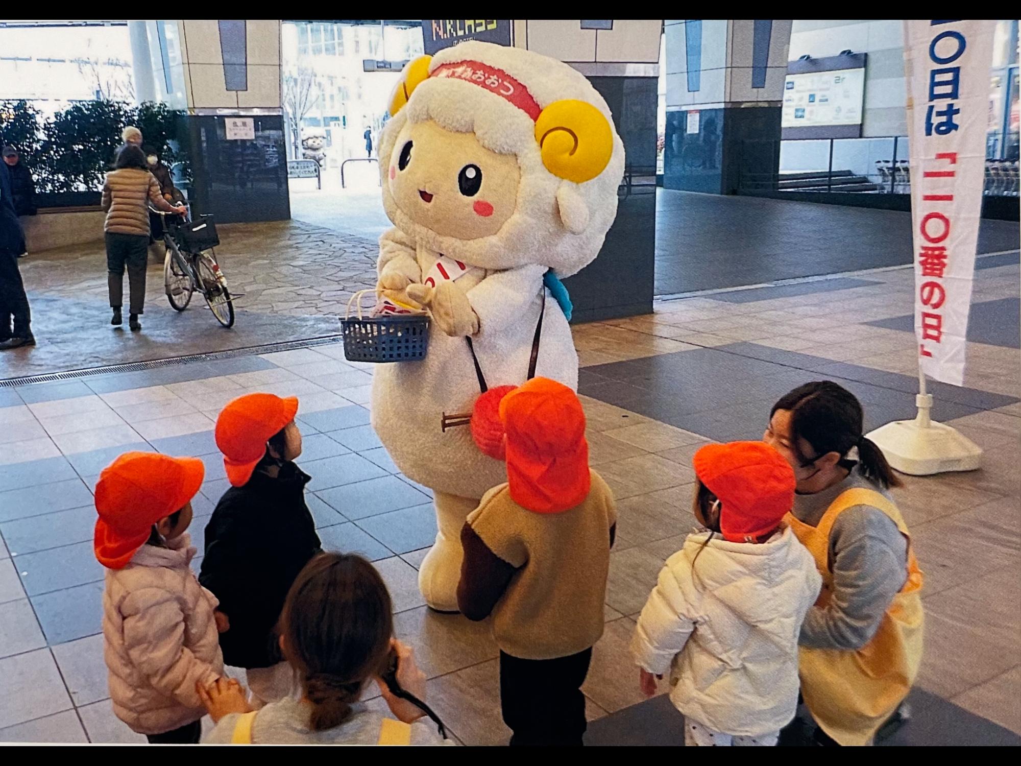 泉大津駅コンコースで、泉大津署のお巡りさんたちと一緒に「110番の日キャンペーン」をした羊~♪