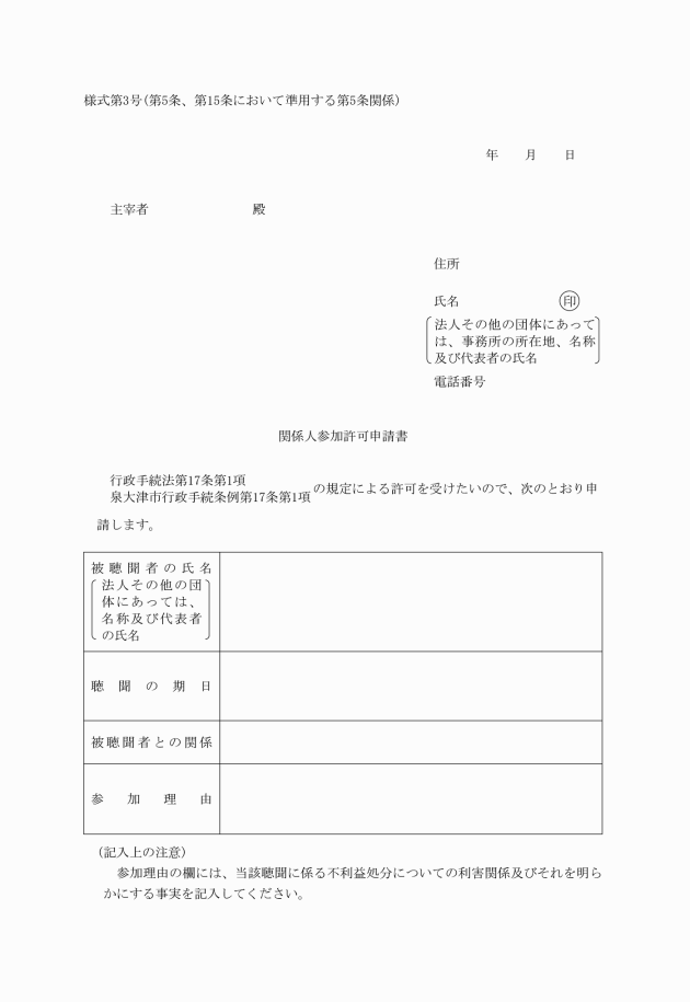 2 法第17条第1項の規定による許可を受けようとする関係人は、聴聞の期日までに、関係人参加許可申請書(様式第3号)を主宰者に提出しなければならない。