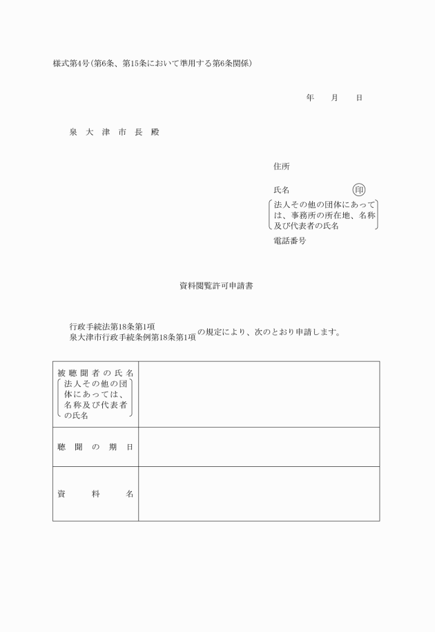第6条 法第18条第1項の閲覧を求めようとする当事者等は、資料閲覧許可申請書(様式第4号)を市長に提出しなければならない。