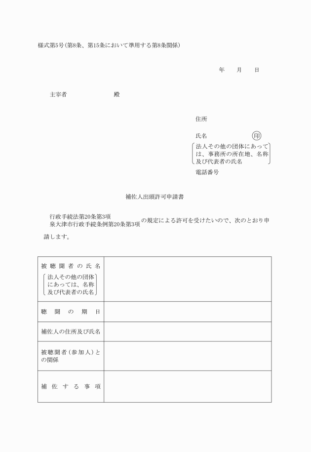 第8条 法第20条第3項の許可を受けようとする当事者又は参加人は、補佐人出頭許可申請書(様式第5号)を主宰者に提出しなければならない。ただし、法第22条第2項(法第25条後段において準用する場合を含む。)の規定により通知された聴聞の期日に出頭させようとする補佐人であって既に受けた許可に係る事項につき補佐するものについては、この限りでない。