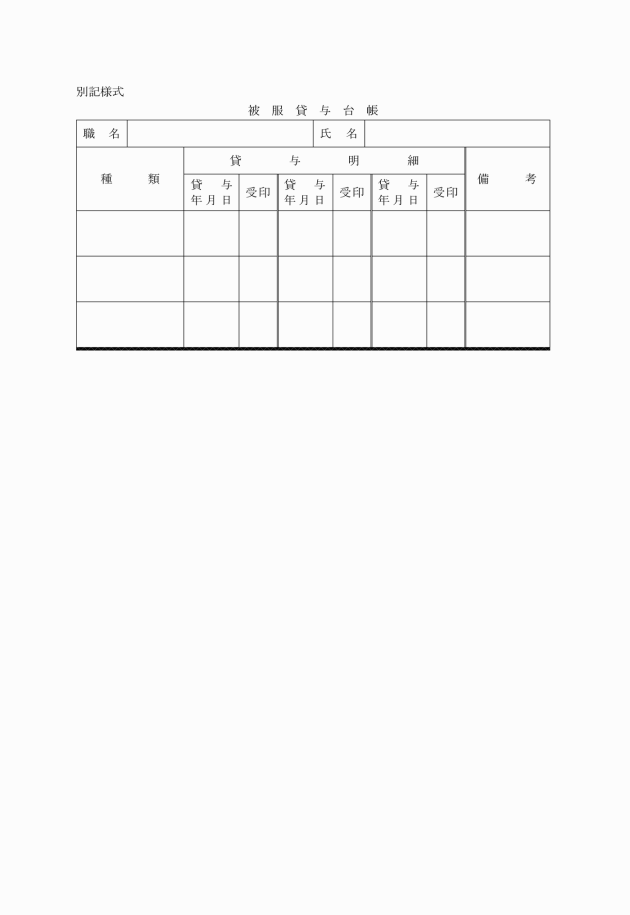 第7条 被服貸与に係る主管課長は、貸与被服の明細を記入した被服貸与台帳(別記様式)を整備し、常に貸与状況を明らかにしておかなければならない。
