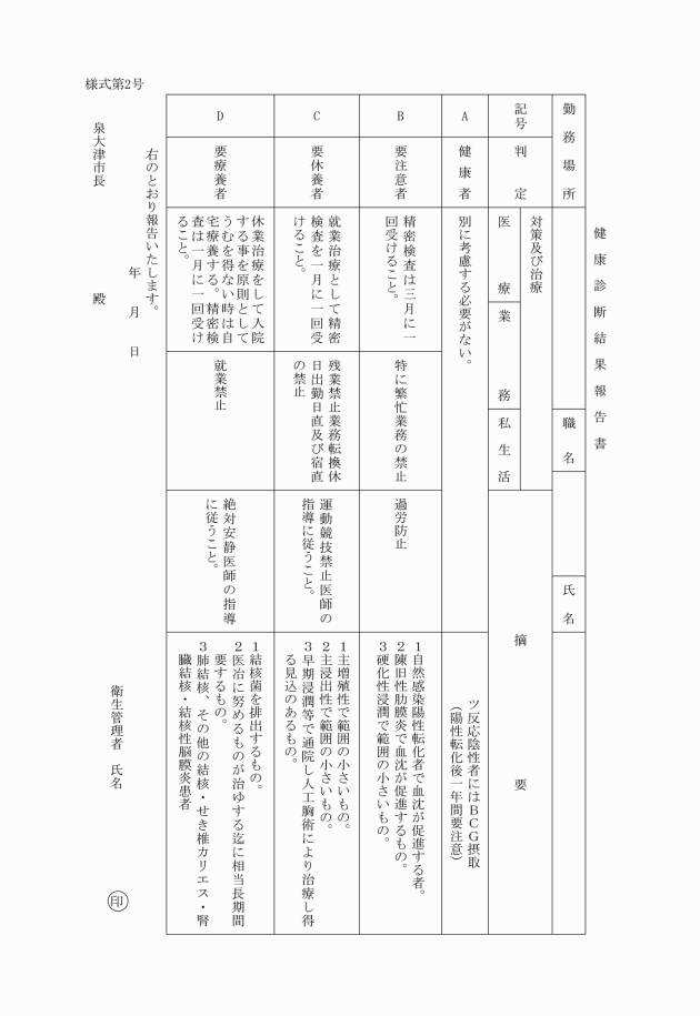 第9条 産業医が健康診断を実施したときは、健康診断結果報告書(様式第2号)により、その結果を市長に報告するとともに本人に対しても通知しなければならない。