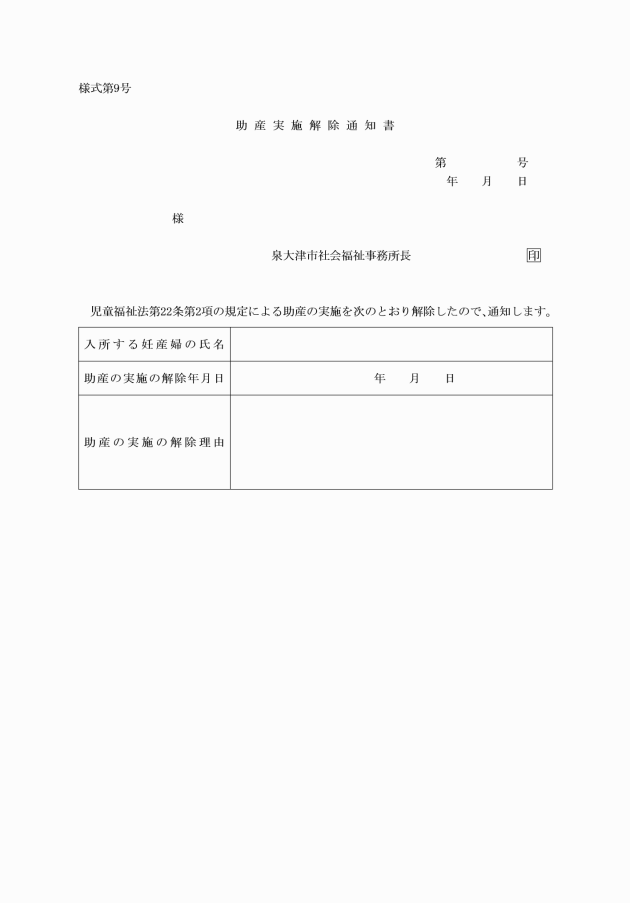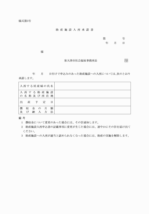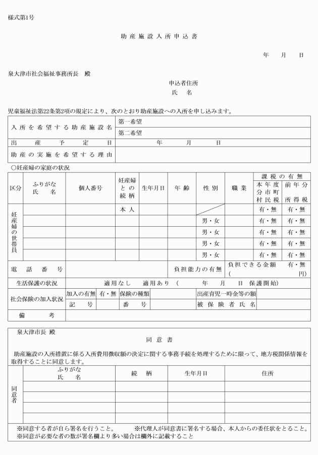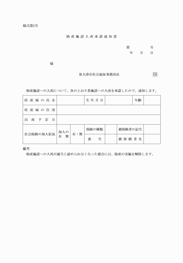 第2条 法第22条第2項の規定により助産の実施を希望する者は、助産施設入所申込書(様式第1号)を社会福祉事務所長(以下「福祉事務所長」という。)に提出しなければならない。