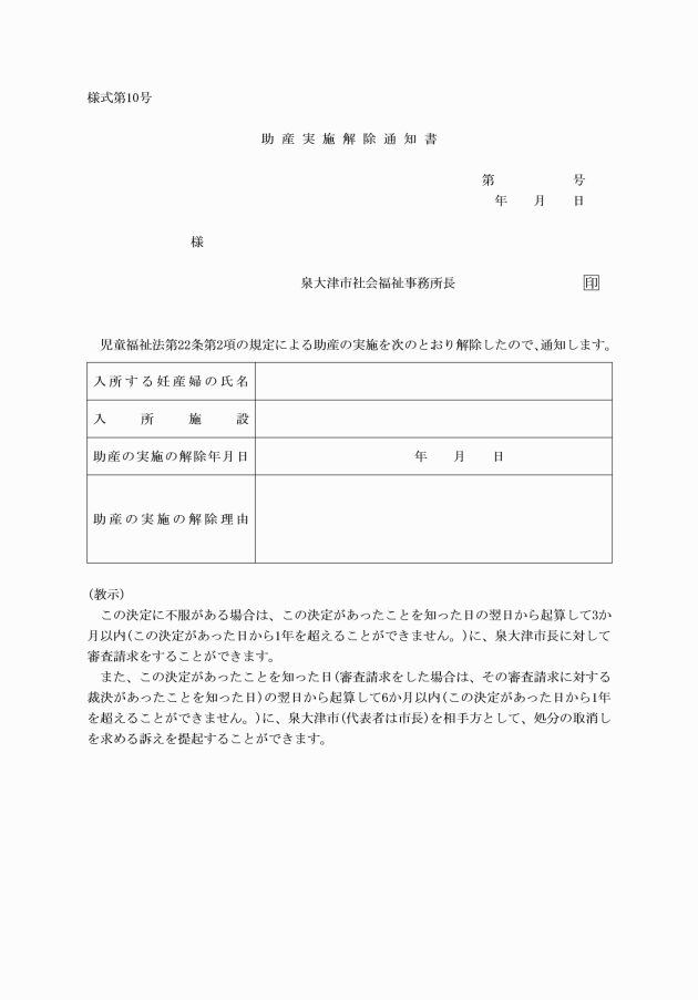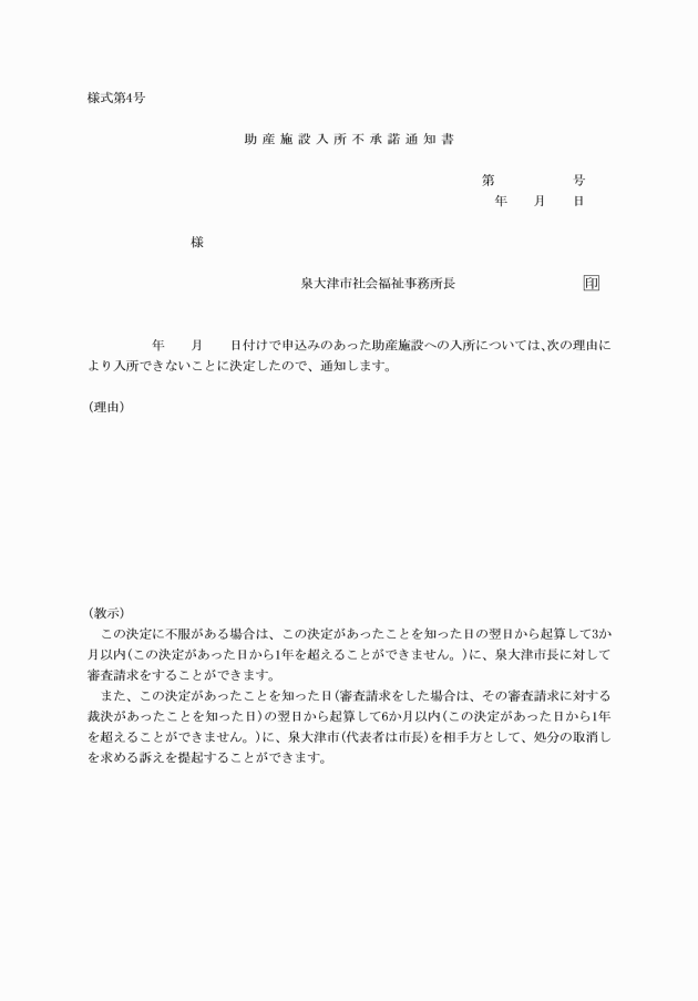4 福祉事務所長は、助産の実施の申込みが適当でないと認めたときは、助産施設入所不承諾通知書(様式第4号)により当該申込みをした者にその旨を通知しなければならない。