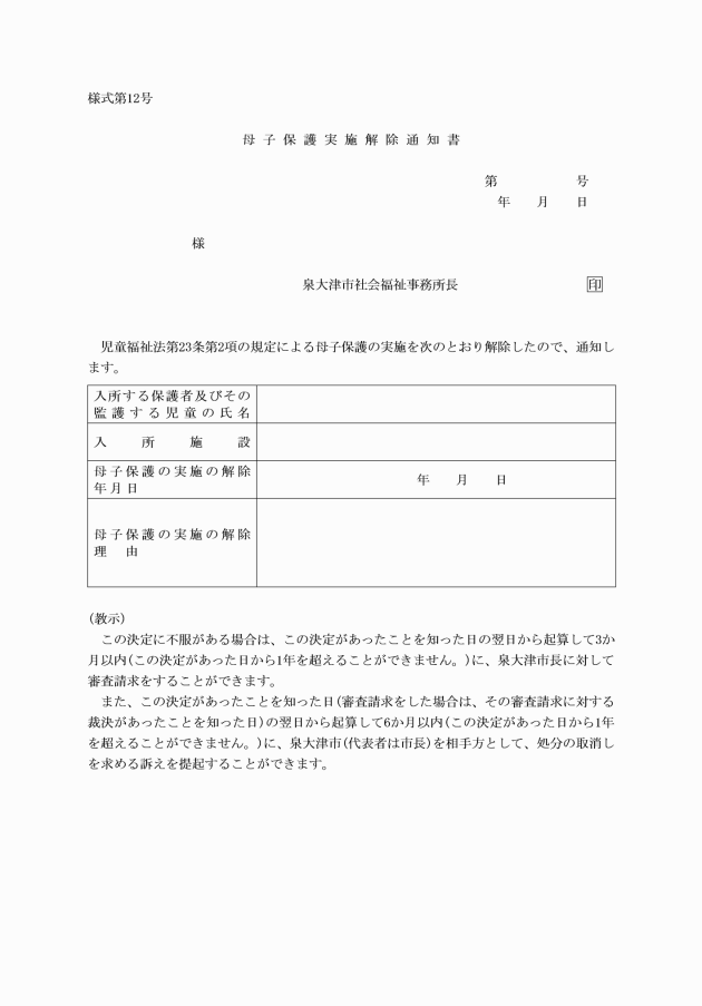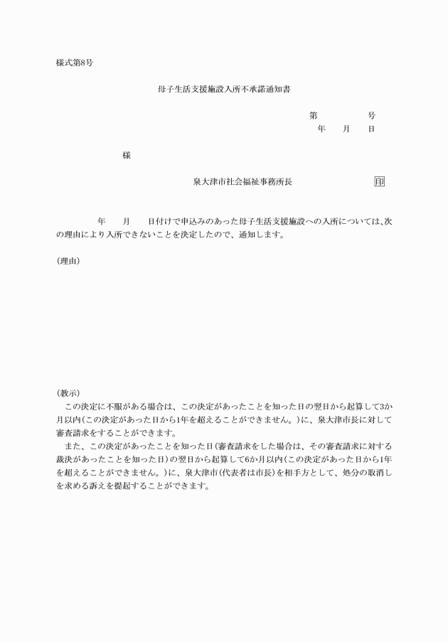 4 福祉事務所長は、母子保護の実施の申込みが適当でないと認めたときは、母子生活支援施設入所不承諾通知書(様式第8号)により当該申込みをした者にその旨を通知しなければならない。