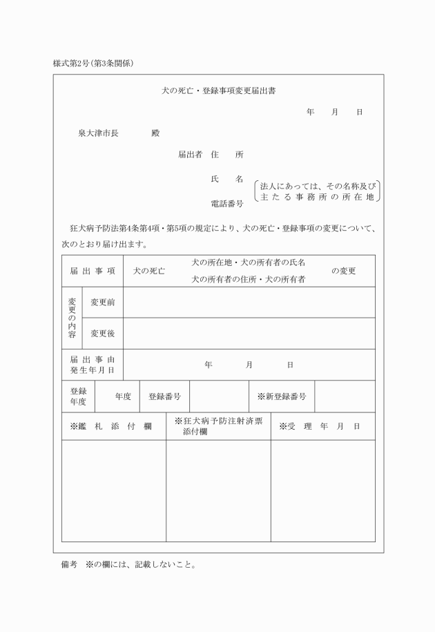 第3条 規則第8条第1項又は第9条の届出書は、犬の死亡・登録事項変更届出書(様式第2号)とする。