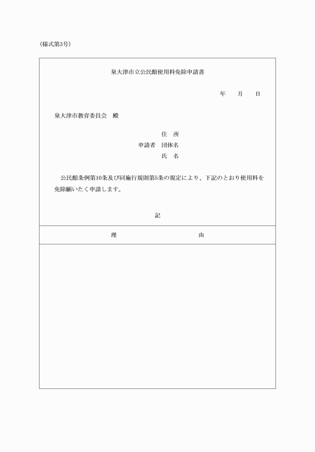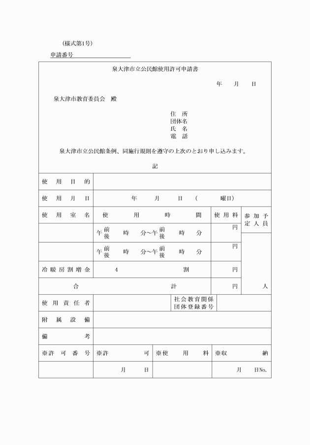 第3条 教育委員会は、提出された泉大津市立公民館(以下「公民館」という。)の使用許可申請について、適当と認めたときは、当該施設の使用区分に従い、使用許可書(様式第2号)を申請者に交付する。