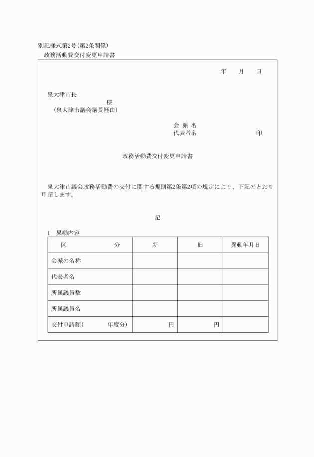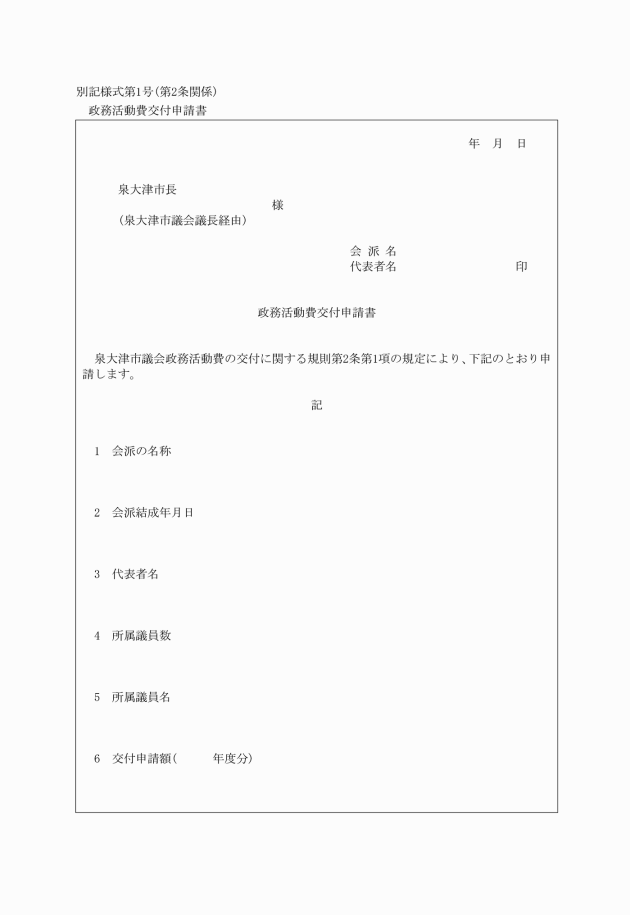 第2条 政務活動費の交付を受けようとする会派の代表者は、毎年度、市長に対し、議長を経由して政務活動費交付申請書(別記様式第1号)を提出しなければならない。