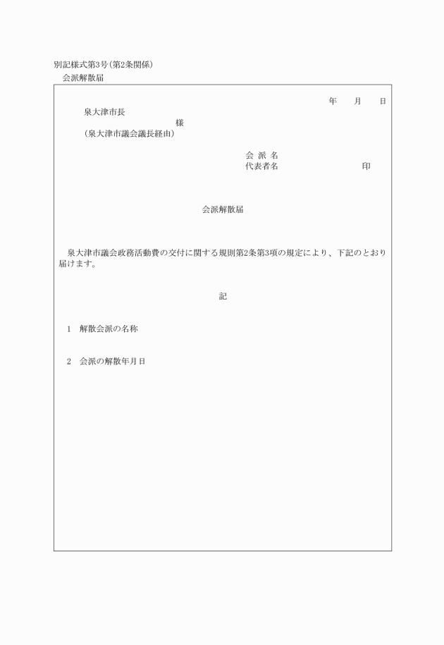 3 会派を解散したときは、当該会派の代表者であった者は市長に対し、議長を経由して会派解散届(別記様式第3号)を提出しなければならない。