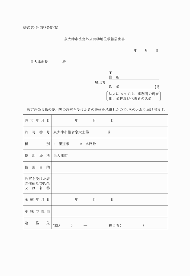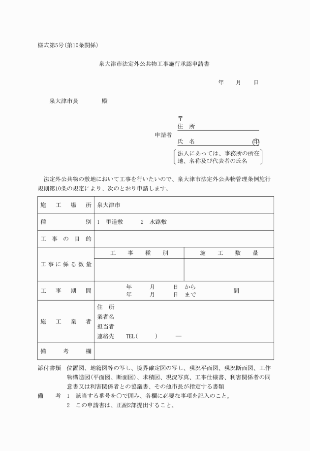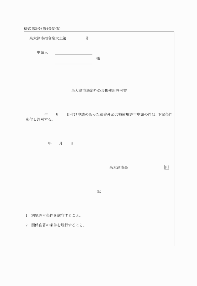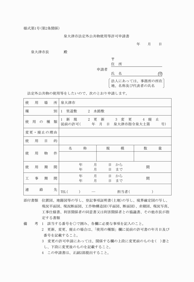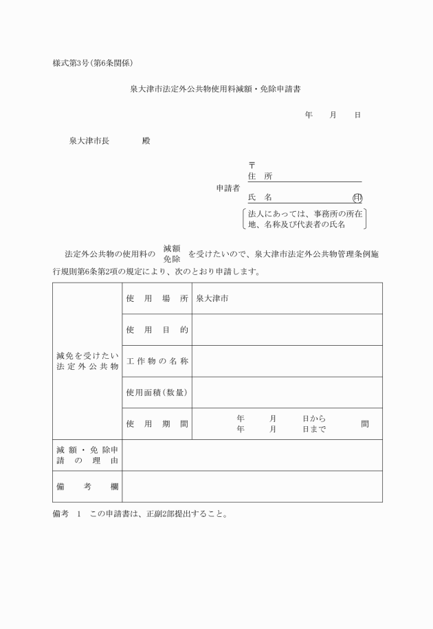 2 使用料の減免を受けようとする者は、泉大津市法定外公共物使用料減額・免除申請書(様式第3号)により、市長に申請しなければならない。