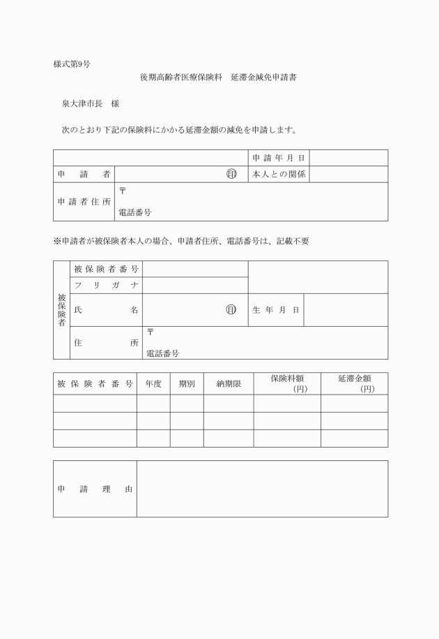 2 延滞金の減免を受けようとする者は、後期高齢者医療保険料延滞金減免申請書(様式第9号)を市長に提出しなければならない。