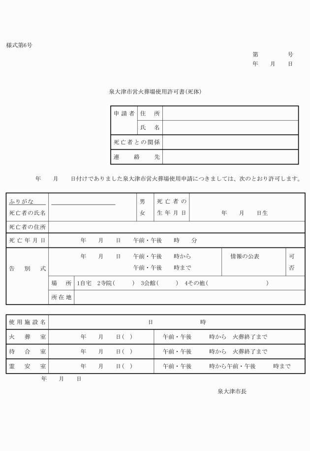 (1) 死体 火葬許可書及び泉大津市営火葬場使用許可証(死体)(様式第6号)
