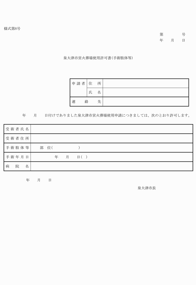 (3) 手術肢体等 泉大津市営火葬場使用許可証(手術肢体等)(様式第8号)