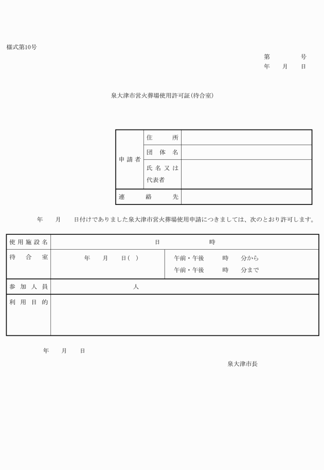 (5) 待合室(コミュニティー施設として利用する場合に限る。) 泉大津市営火葬場使用許可証(待合室)(様式第10号)