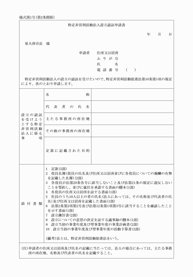第2条 法第10条第1項の申請書は、特定非営利活動法人設立認証申請書(様式第1号)とする。