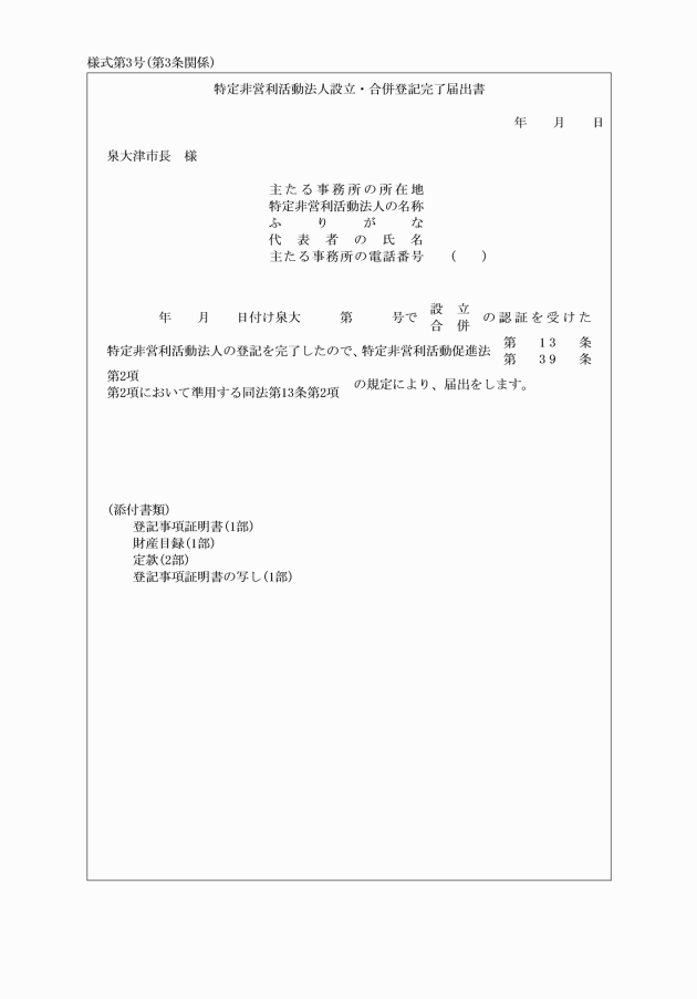 第3条 法第13条第2項(法第39条第2項において準用する場合を含む。)の規定による届出は、特定非営利活動法人設立・合併登記完了届出書(様式第3号)を提出することにより行わなければならない。